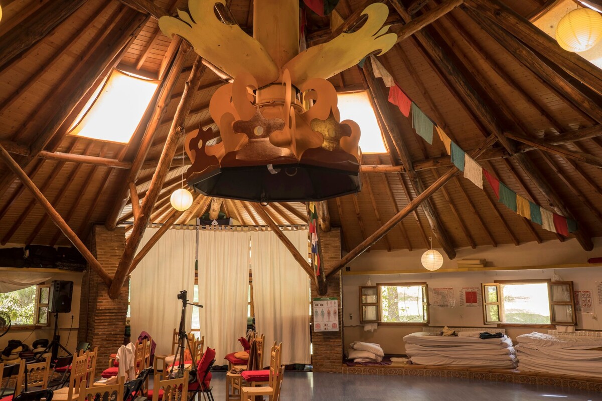 Su sala circular de 220 m², una de las más valoradas de Europa, ofrece un espacio único para la práctica de yoga, meditación y dinámicas grupales. El suelo de madera, la acústica armónica y la chimenea central crean una atmósfera inspiradora y envolvente.